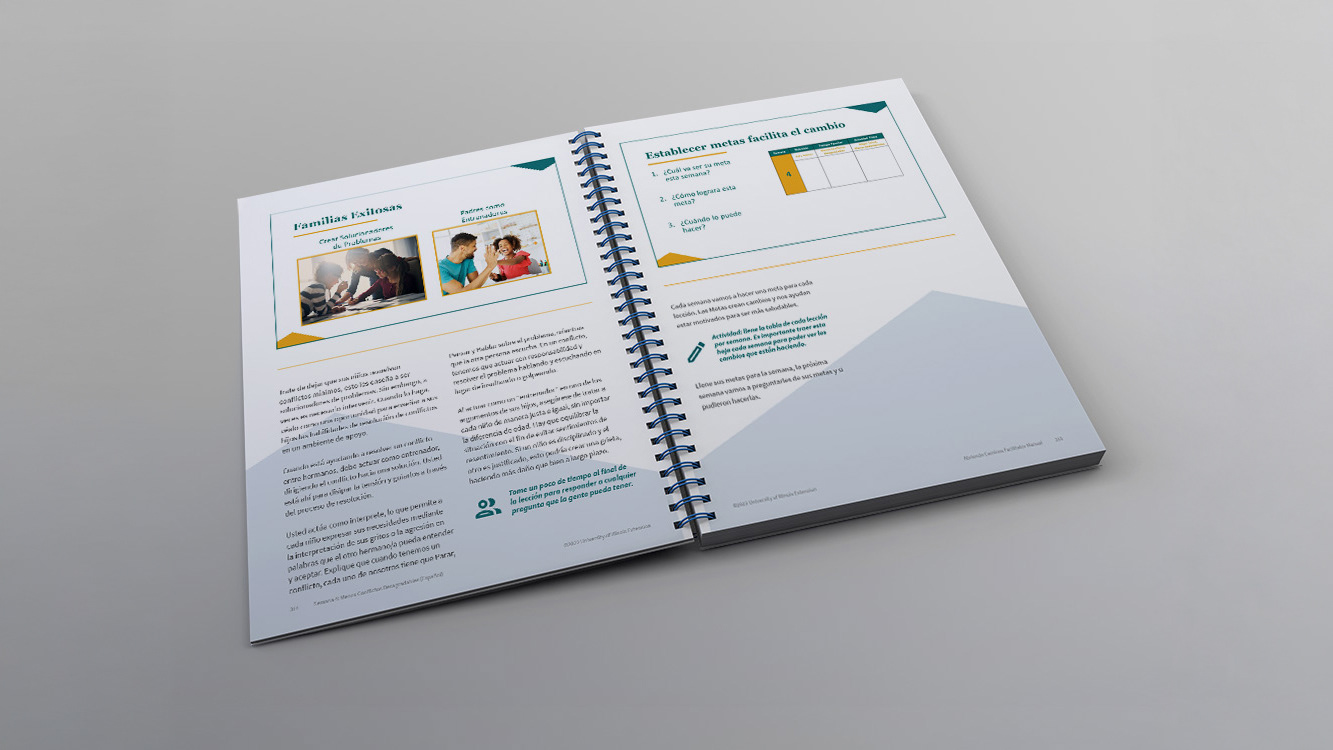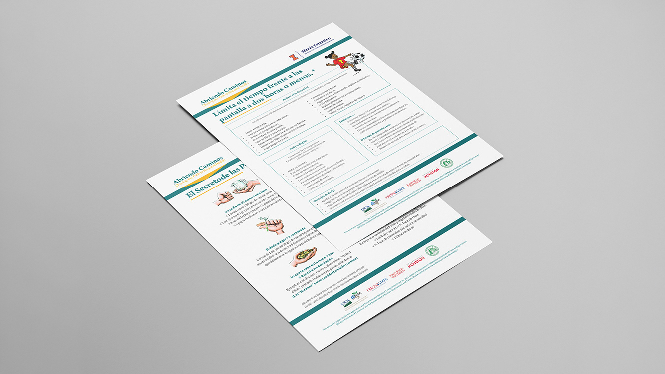 Abriendo Caminos is an education series sponsored by University of Illinois Extension that aims to combat childhood obesity by engaging the whole family in making better decisions to promote a healthy lifestyle. The goal of this project was to create a clean, approachable look for the materials package that would appeal to multiple generations of family members, while also efficiently communicating the intended message across multiple languages. While the materials were only designed in English and Spanish, there was talk of eventual translations in more languages, so future-proofing was also a goal. These materials were also created using a framework in Adobe InDesign that allowed the client to have the option to digitally distribute the curriculum and was accessible to screenreaders. This project represents well over 500 design hours and was an immense undertaking as the sole designer assigned.
