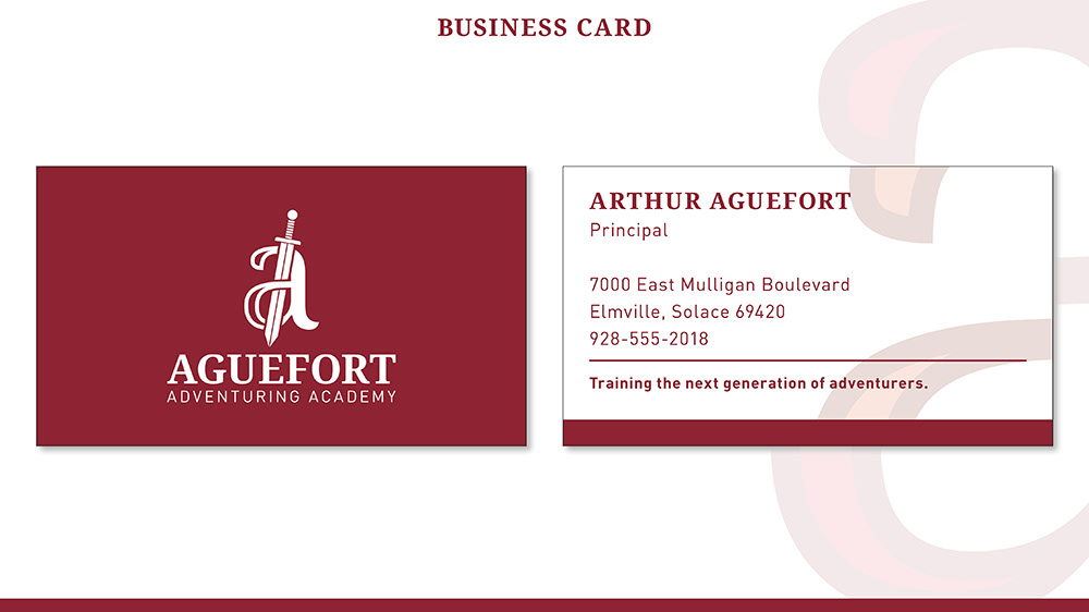 A branding package for the Aguefort Adventuring Academy, a fictional school from season one of the Dropout.tv show "Dimension 20." The school is a training ground for adventurers in a Dungeons and Dragons universe created to answer the question: "What would it look like if John Hughes wrote a D&D campaign?" As such, I wanted to give the branding a feeling of being modern while also conveying a sense of age since the school has trained many generations of adventurers. This was honestly just a labor of love to make as a fan of the show, and I thoroughly enjoyed the process.