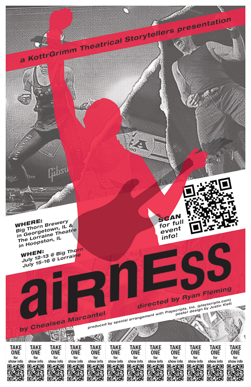 This project was a poster design for a stage production of Airness, a fun play about self-discovery and embracing your inner weird that's set in the world of competitive air-guitar. I was inspired by grunge-era Xerox collage gig posters, and I wanted to have some fun going outside of my style comfort zone. I also felt particularly inspired to do the tear-off tab QR codes for more info because that felt like a fun interactive element, even though it would mean more setup work.