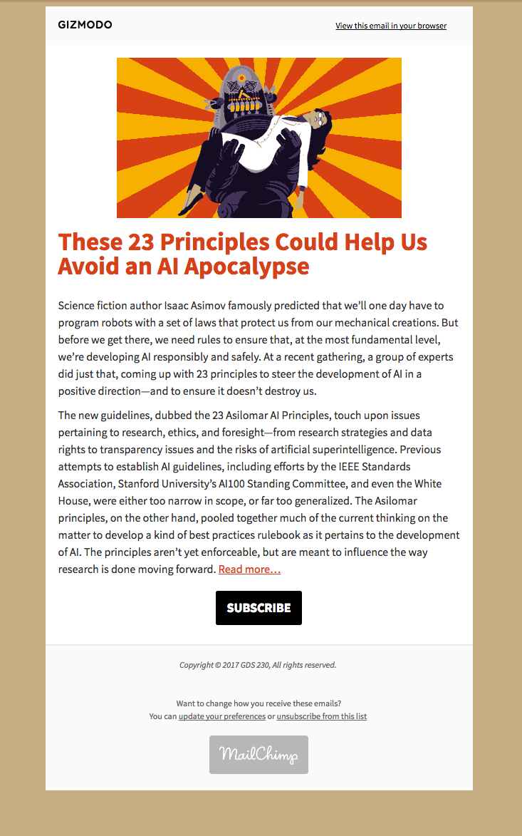 This motion graphic was created for an article on Gizmodo.com. The subject of the article was artificial intelligence. More specifically, how the scientific community can avoid the possibility of a robotic uprising should artificial intelligence ever be achieved. I felt this subject was a wonderful opportunity to throw in a little camp, so I created this animation to offset the serious nature of the article. The animation is heavily based on the poster for the 1956 movie "Forbidden Planet" and captures the over-the-top nature of how films from that era pictured rampaging robots in the future.