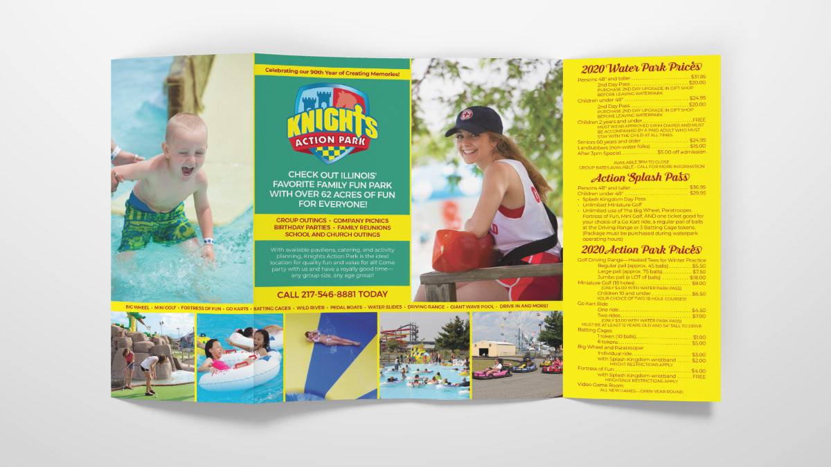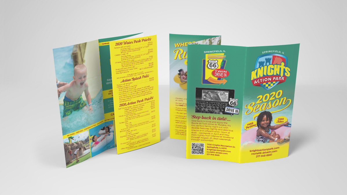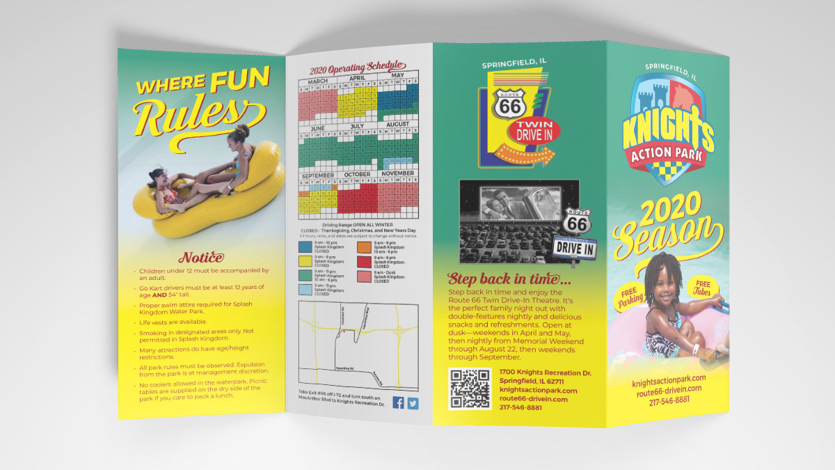 Knight's Action Park asked me to create a brochure and rack card for their 2020 season and 90th year of operation. While there was a lot of information that needed to be included, I also wanted to give plenty of room for visual elements to help the brochure pop. The purpose of going to Knights Action Park, after all, is to have fun, and I wanted to make sure that was put forward first and foremost.
